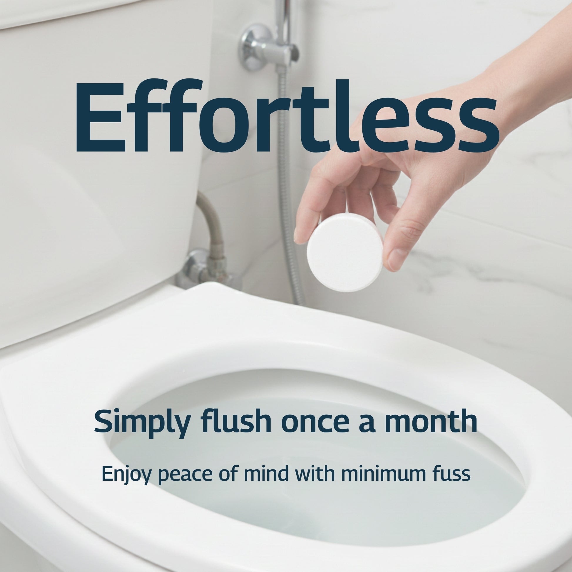 - Effortless: Simply drop in a tablet and flush down a connected toilet.